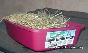 Final litter box set up: Once you have selected your litter box and litter, place an appropriate amount of litter in bottom of litter box, place hay on one end and as a light cover as well. Then the litter box is ready for your rabbit.